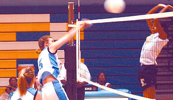 C.B. Aycock's Lindsey Newman (5) goes up for a point against Goldsboro in the teams' match at the Aycock gym Tuesday. Defending is Goldsboro's Carmille Early. Looking on is Aycock's Julia Lancaster (3).