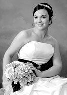 She wore a satin gown with a strapless bodice with pick-ups on the A-line skirt and a chapel-length train. It was accented with a black satin sash.